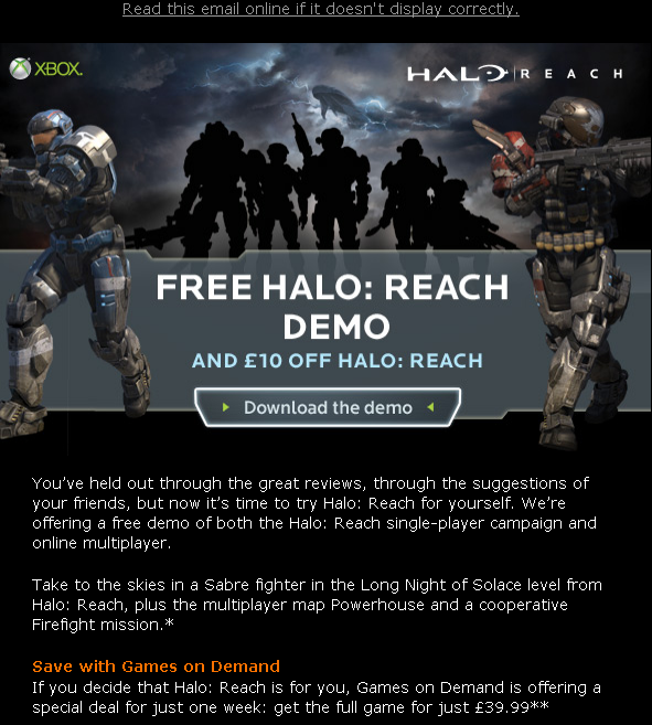 I guess it’s nice of Microsoft to check the list of games i own & suggest stuff for me to play, even if the only suggestions are from franchises they own. “Try the demo & if you like it, get a discount” is a good deal & i was about to download the demo before I scrolled to the bottom of the email.